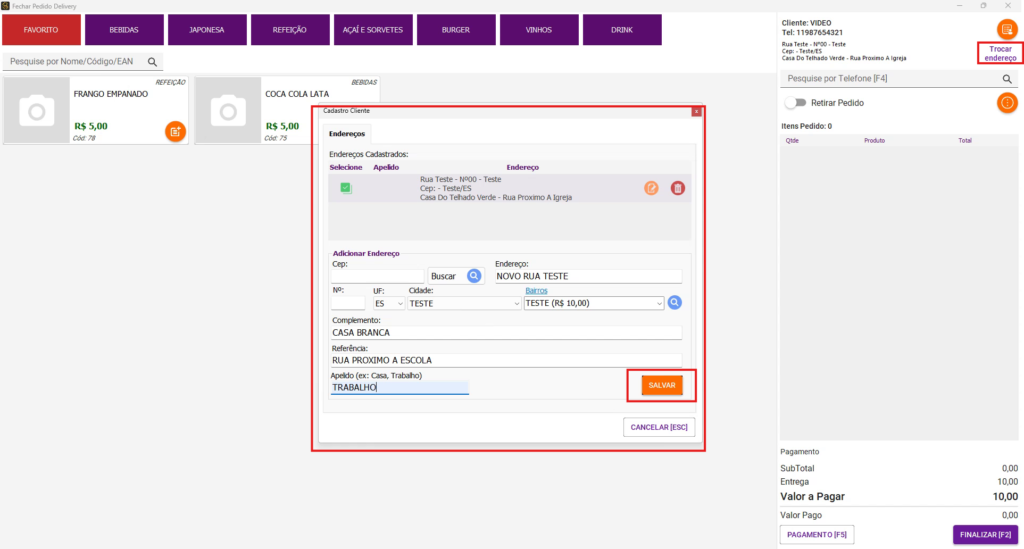 O sistema listará o novo endereço com o apelido atribuído (ex.: Trabalho) junto com os demais endereços do cliente.