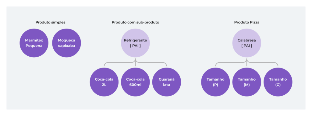 - Pizza: O produto pizza é separado pelo sabor (definido no produto pai) e os “produtos filho” são os tamanhos de cada pizza.