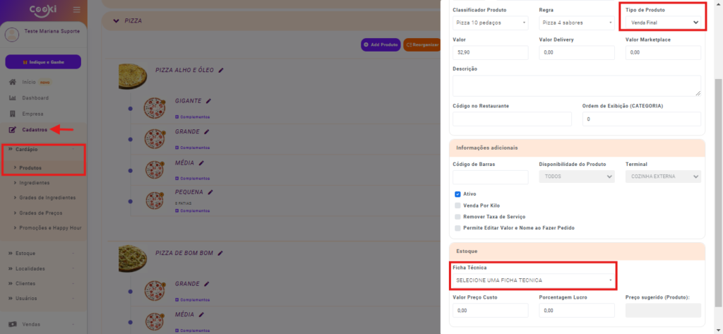 Produtos Pizza ou com Subprodutos: A ficha técnica deve ser vinculada a cada um dos “produtos filhos” (melhor explicado no conteúdo sobre Cardápio). Não é possível vincular ao produto principal. Pense comigo: há pizzas de diversos tamanhos, e cada uma pode usar quantidades diferentes de insumos. Isso significa que o sistema te dá essa flexibilidade no controle. 😊👌