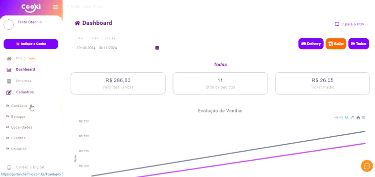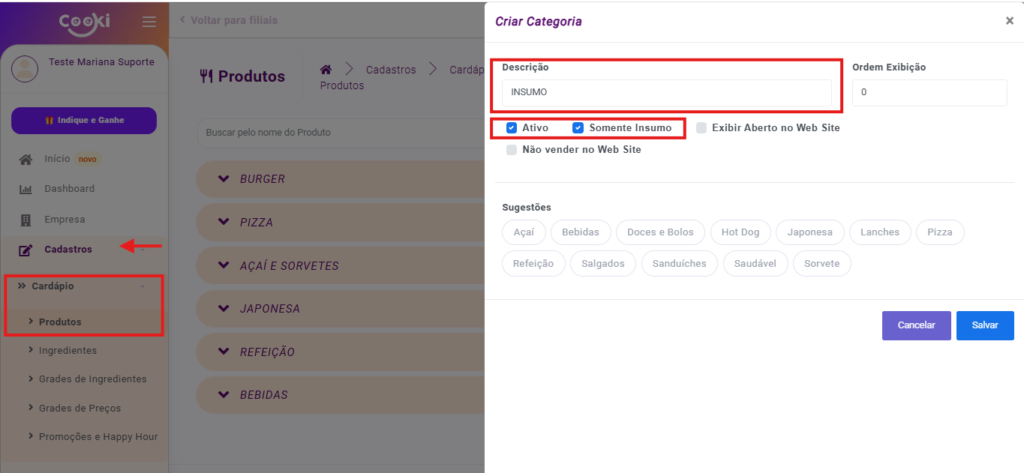 1º Clique em “Cadastros” > “Cardápio” > “Produtos”;