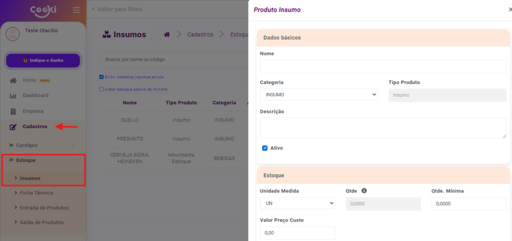 - Nome do Insumo: Defina o nome do insumo que está cadastrando