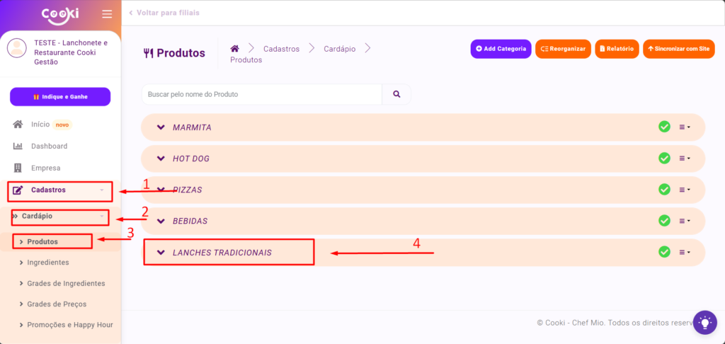 - Vá em ‘Cadastros’ (1), depois ‘Cardápio’ (2), e selecione ‘Produtos’ (3). Em seguida, clique na Categoria (4) onde deseja criar o produto.