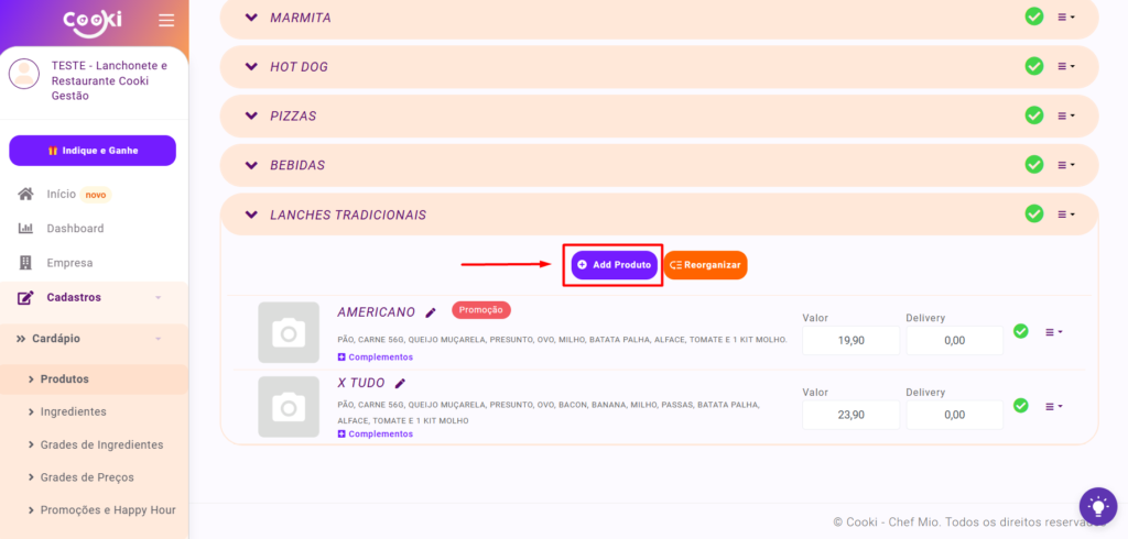 - Inicialmente, devemos acessar o portal Cooki e seguir para a área de registro e configuração do cardápio.