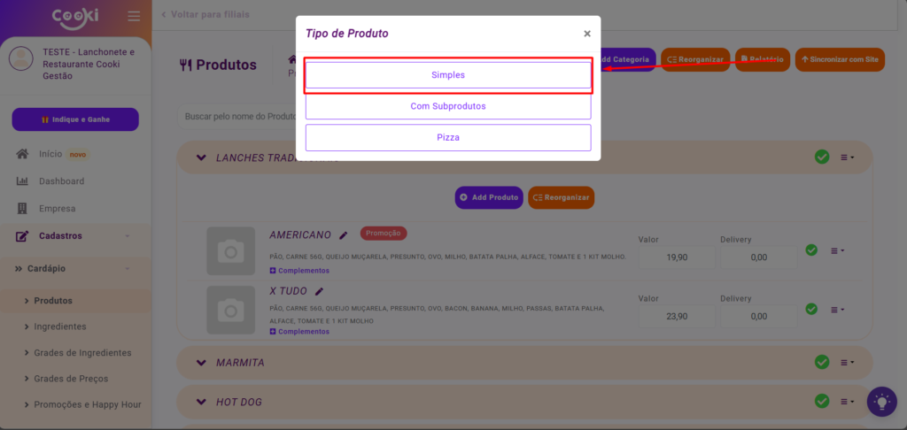 Ao clicar em ‘Add Produto’, o sistema apresentará uma janela denominada ‘Tipo de Produto’, que oferece as opções ‘Simples’, ‘Com Subprodutos’ e ‘Pizza’. Por enquanto, selecionaremos a opção ‘Simples’.