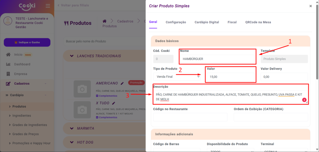 - Agora iniciaremos o cadastro do produto. Primeiro, insira o nome do produto (1), em seguida, defina o preço (2) e, por fim, adicione a descrição (3). Na descrição, você pode incluir os ingredientes do produto ou outras informações relevantes.