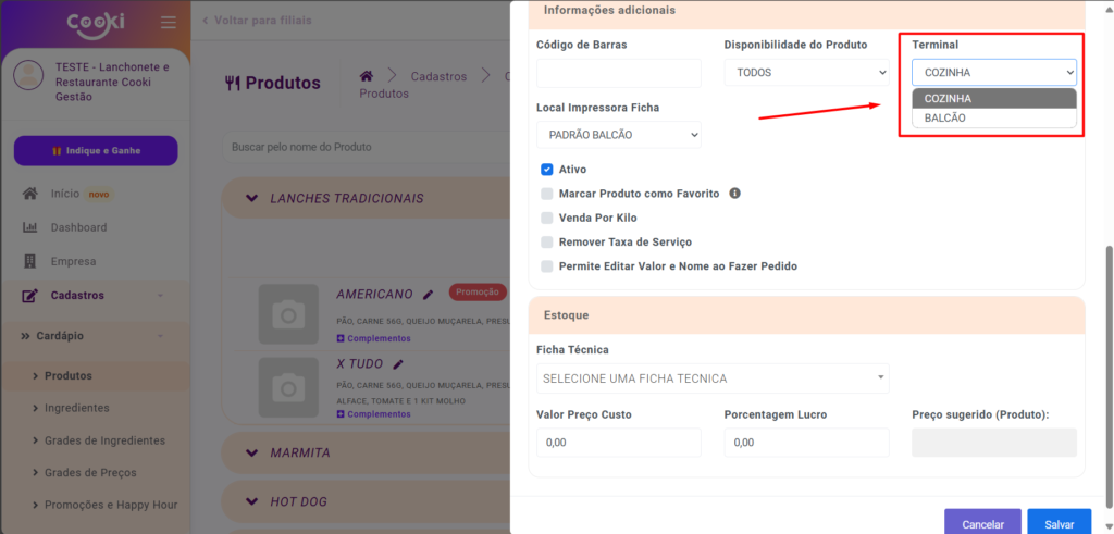 - Ao rolar a página de cadastro do produto para baixo, podemos configurar o terminal onde o produto será impresso. No nosso exemplo, escolherei o terminal da cozinha, assim, sempre que este pedido for realizado, será impresso neste terminal específico.