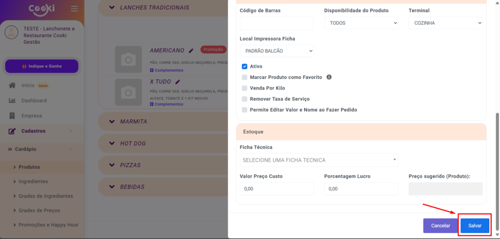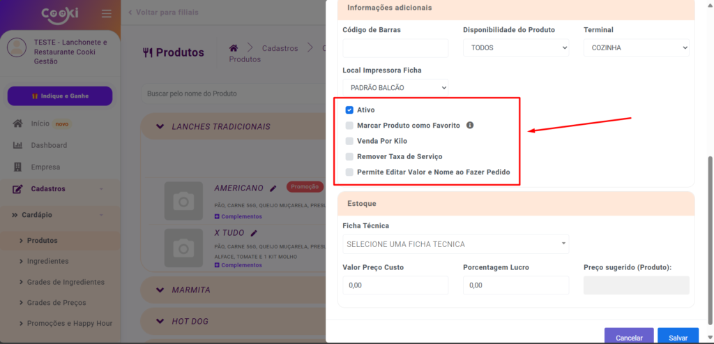 - Ativa: Se o produto aparecerá no cardápio digital e no salão para vendo.
