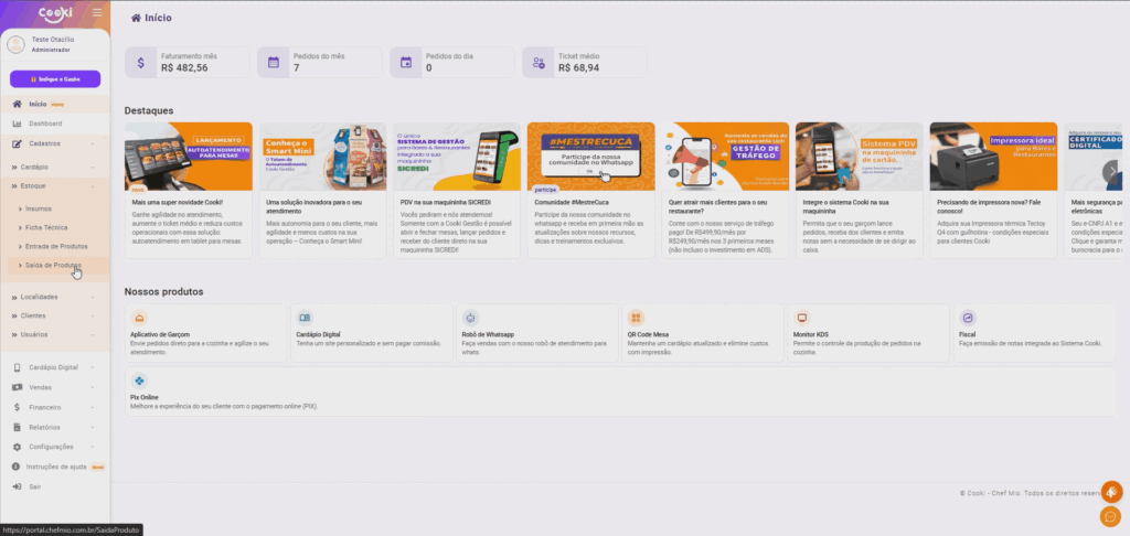 1º Clique em “Cadastros” > “Estoque” > “Saída de Produtos” no menu;