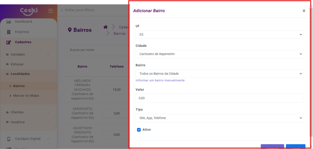 9º O campo “Ativo em”, na mesma tela, é um tipo de atalho para você ativar ou desativar entregas para aquele bairro específico. Você também consegue fazer isso dentro do cadastro do bairro no campo “Tipo” (melhor explicado no passo 6º), mas há essa opção na tela para facilitar.