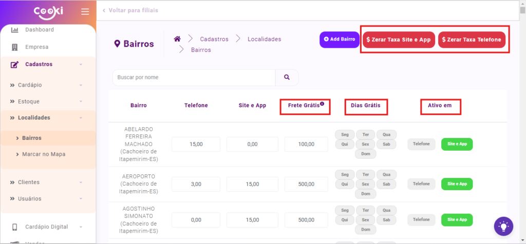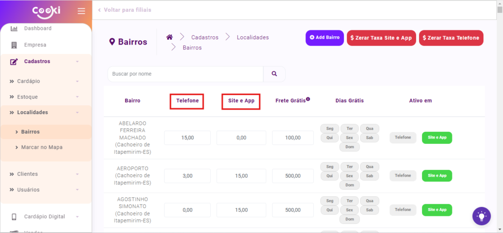A taxa de entrega por bairro, como o nome já diz, é fixa por bairro. Para configurá-la, siga o passo a passo: