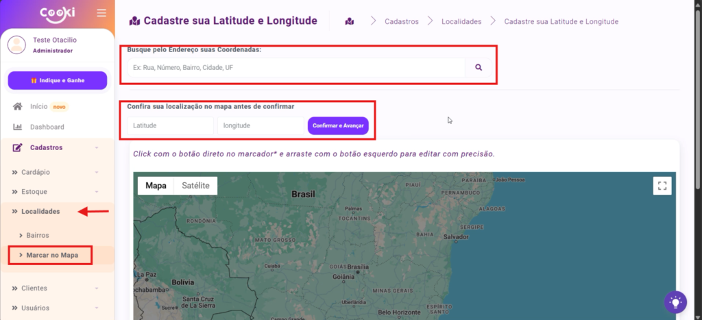 - Ao incluir o endereço no campo de busca e clicar em “buscar”, o sistema identificará automaticamente a sua latitude e longitude;