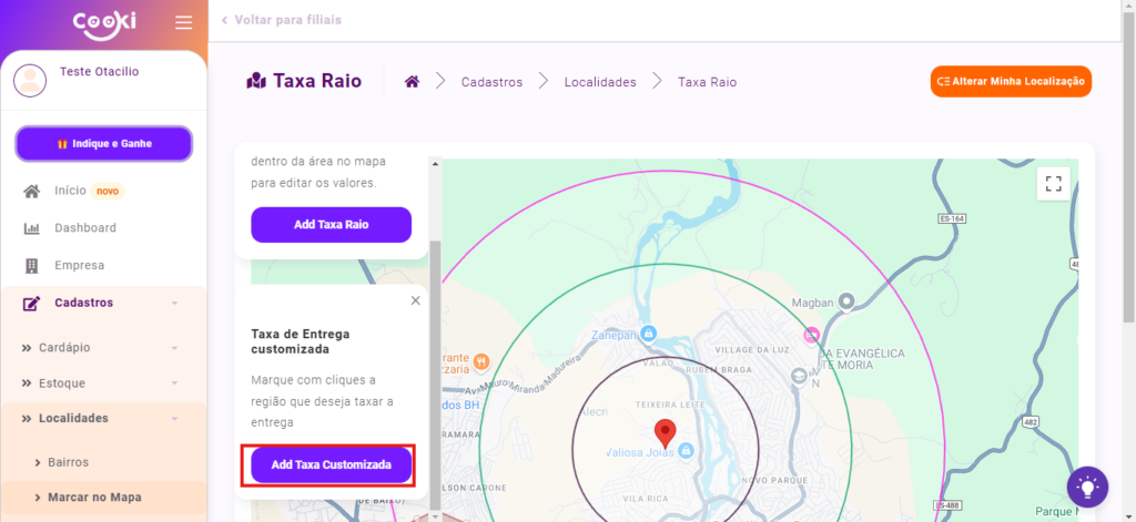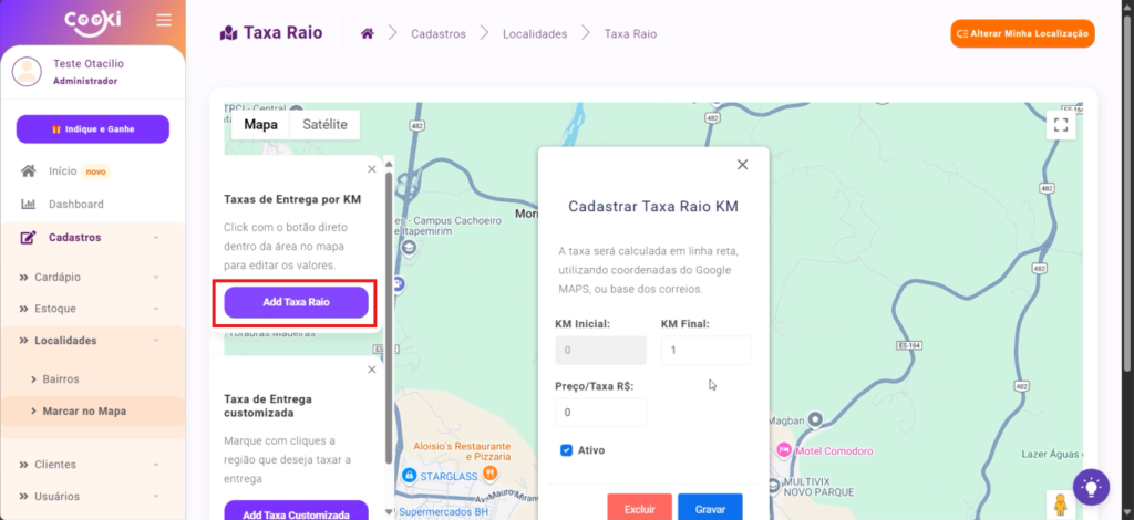 Com a localização definida, uma opção à esquerda permitirá adicionar taxas de entrega por raio: “Taxas de Entrega por KM”.