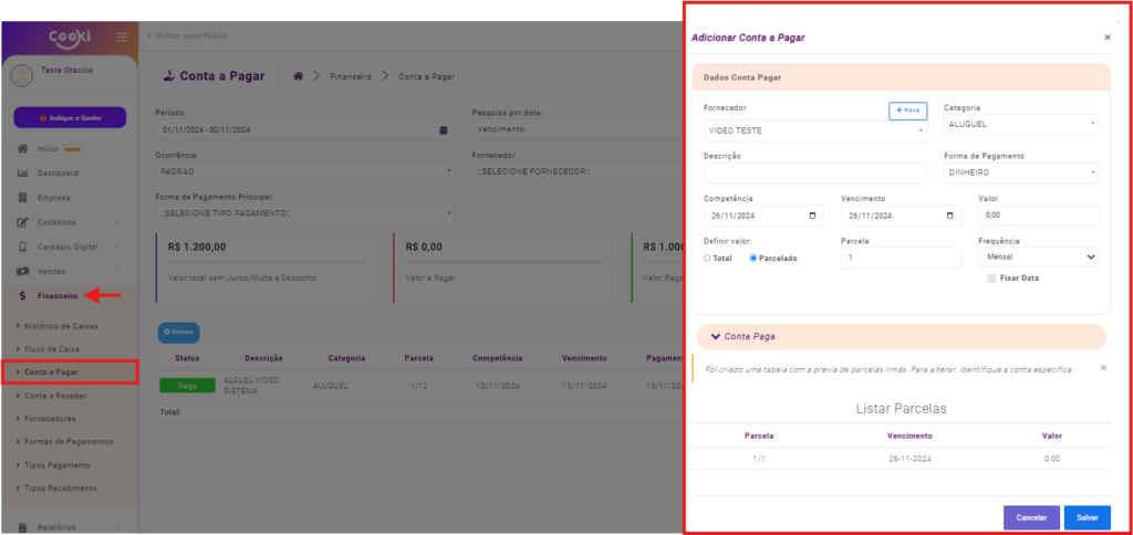 - Parcelado: O sistema replicará o valor total pelo número de parcelas especificado.