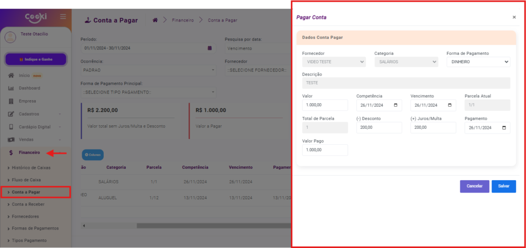 1º No menu esquerdo, clique em “Financeiro” > “Contas a Pagar”;