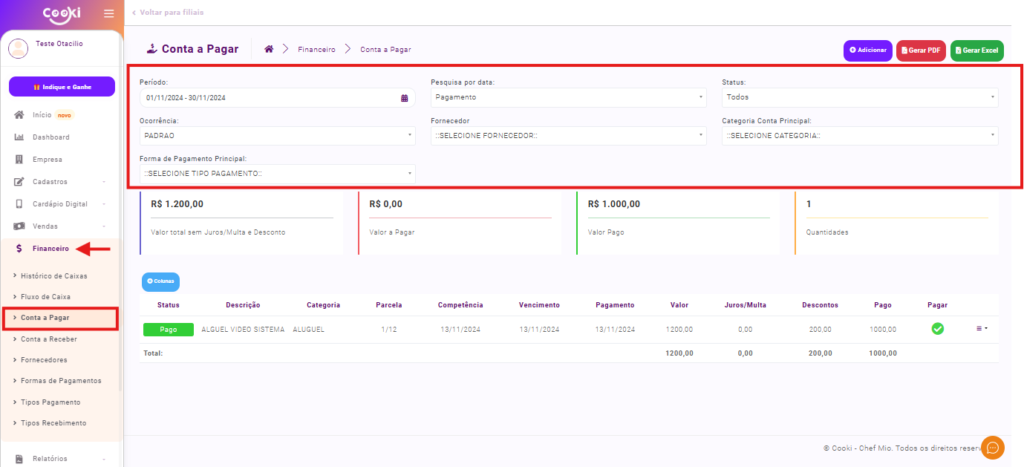 - Pagamento: Para ver as contas pagas no período que você especificará