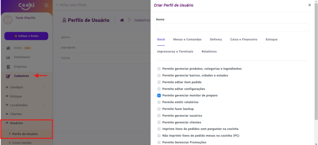 4º Escolha as permissões que esse perfil terá no Portal Cooki e salve;