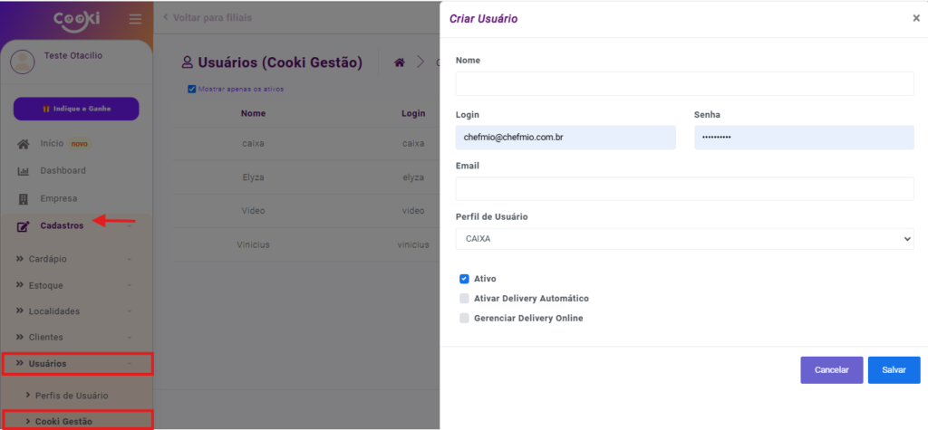 1º No menu à esquerda, vá até “Cadastros” e clique em “Usuários” e, posteriormente, em “Cooki Gestão”;