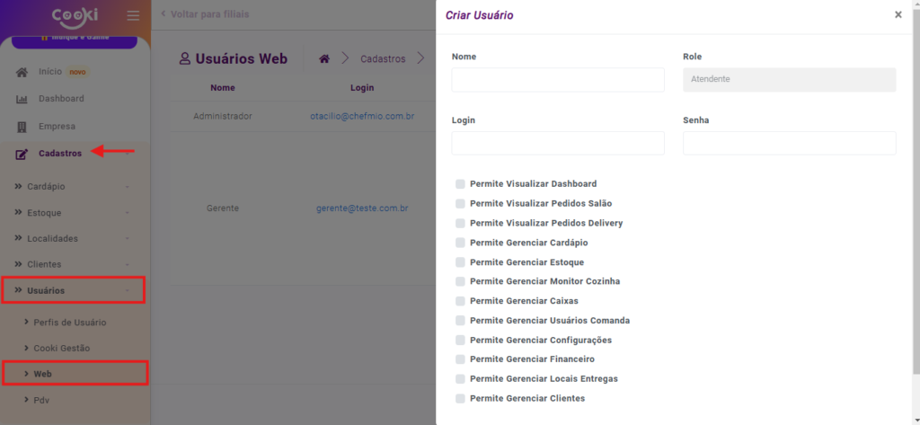 1º No menu à esquerda, vá até “Cadastros” e clique em “Usuários” e, posteriormente, em “Web”;