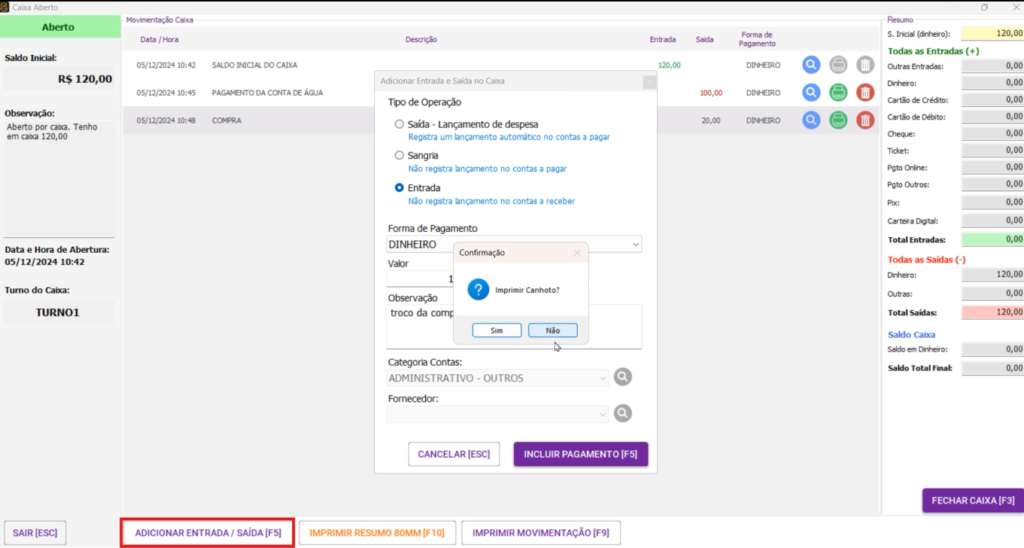 Observação 2: No resumo, a entrada constará como outras entradas, facilitando a conferência no fechamento do caixa.