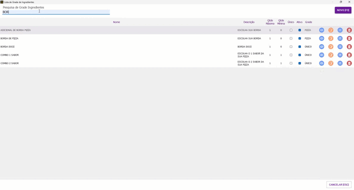 Após adicionar todos os ingredientes e configurar os valores para os tamanhos, clique em Cancelar para sair da tela de edição. A grade de borda estará pronta para ser vinculada às pizzas.