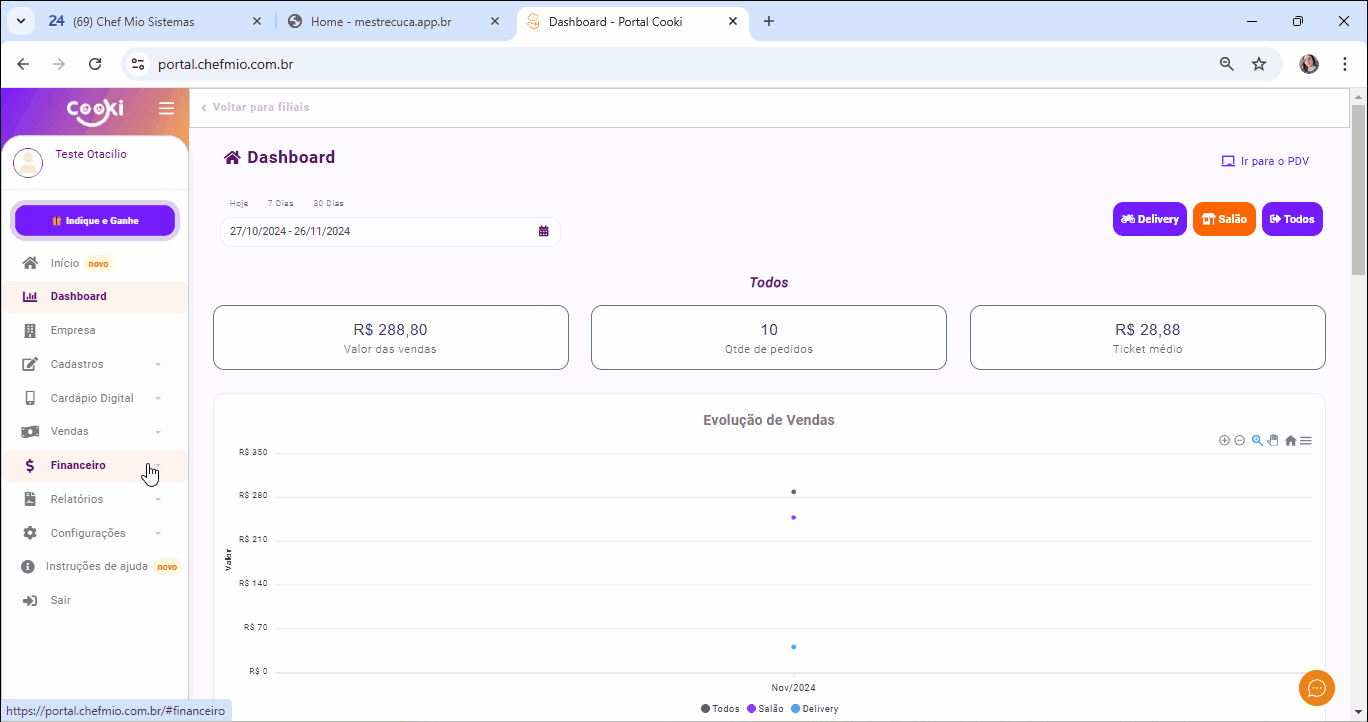 1º Clique em “Financeiro”>”Histórico do Caixa”;