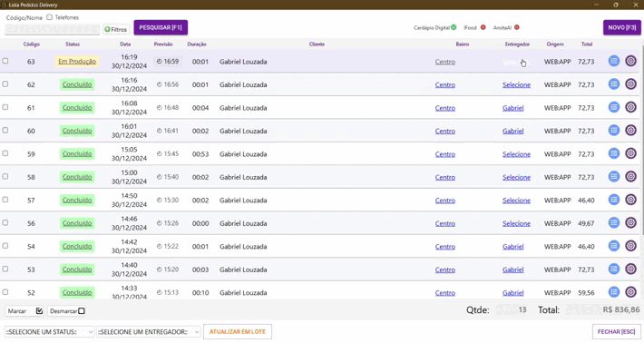 2º Clique no status Em Produção para alterar e escolha a opção Saiu para Entrega.