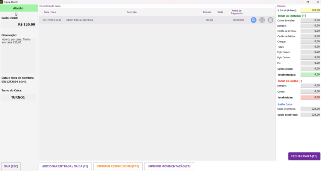 - Lado direito você verá o resumo do caixa, apresentando: